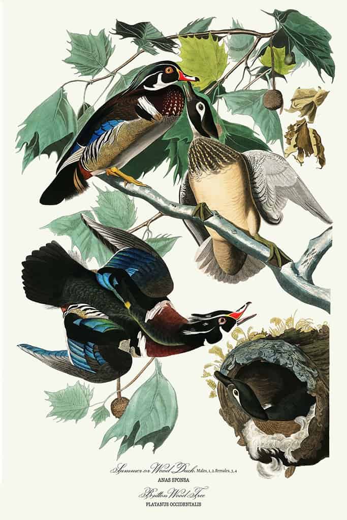 Illustratie van Zomer of Hout eend (Anas Sponsa) door de Amerikaanse ornitholoog en schilder John James Audubon. Tijdens zijn leven heeft de wetenschapper 25 nieuwe soorten geïdentificeerd.