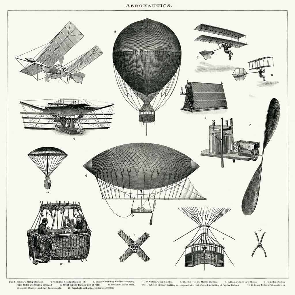 Deze retro-illustratie toont allerlei luchtmachines uit het boek New Popular Educator (1904). Vroege luchtmachines omvatten alle vormen van vliegtuigen die werden bestudeerd of gebouwd voor de ontwikkeling van een modern vliegtuig in 1910.