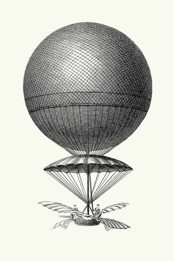 Een coole vintage grafische illustratie van een luchtballon. De heteluchtballon is de eerste succesvolle mensdragende vluchttechnologie. En ook ze zien er geweldig uit! De eerste succesvolle heteluchtballonvlucht werd uitgevoerd door in 1783 in Frankrijk.