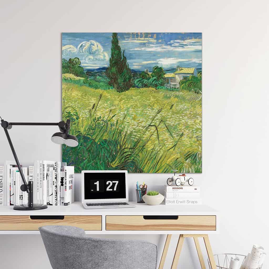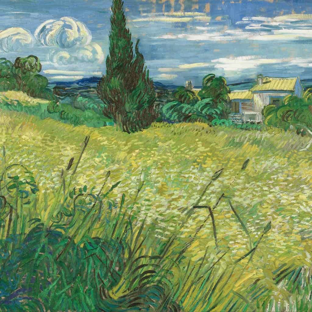 In juni van het jaar voor zijn dood schilderde Van Gogh dit groene graanveld met cipres. Een van zijn vele korenvelden. Hij schreef over de overgang van het groen naar de meer gele tint; een fascinatie voor het steeds volwassener worden van het graan. Dit in tegenstelling tot het verder weg gelegen landschap met blauwe en violette tinten.
