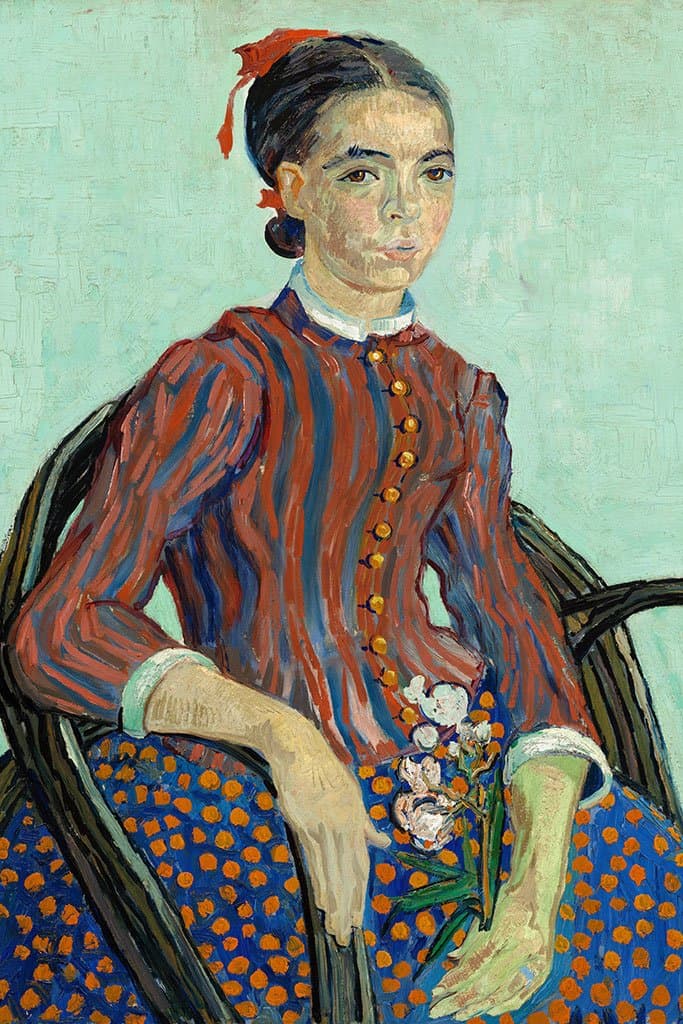 Van Gogh schilderde het in de Arles met een niet-Japans model. Oleander in haar hand maakt het meer Provence. De portretten van Van Gogh kwamen uit zijn ziel. Het was een periode waarin hij nog steeds gelukkig was. Dat is duidelijk te zien aan zijn kleurgebruik.