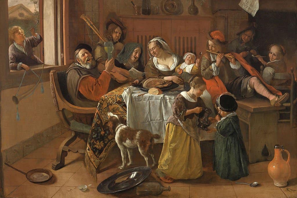 De "Vrolijke Familie" is een van de meesterwerken van Jan Steen. De kunstenaar schilderde graag levendige taferelen die chaos en wellust uitbeeldden. Uit dit schilderij kunnen we veel leren over het dagelijks leven in de Gouden Eeuw.