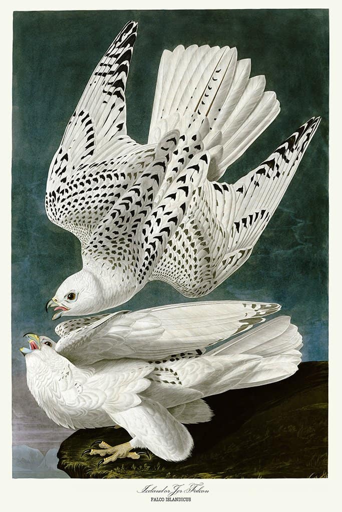 Nog een illustratie van John John James Audubon''s "Birds of America". De kunsthistorici beschrijven het werk van Audubon als zijnde van hoge kwaliteit en gedrukt met "artistieke finesse". IJsland of Jer Falcon (Falco Islandicus) is een grote edele vogel.