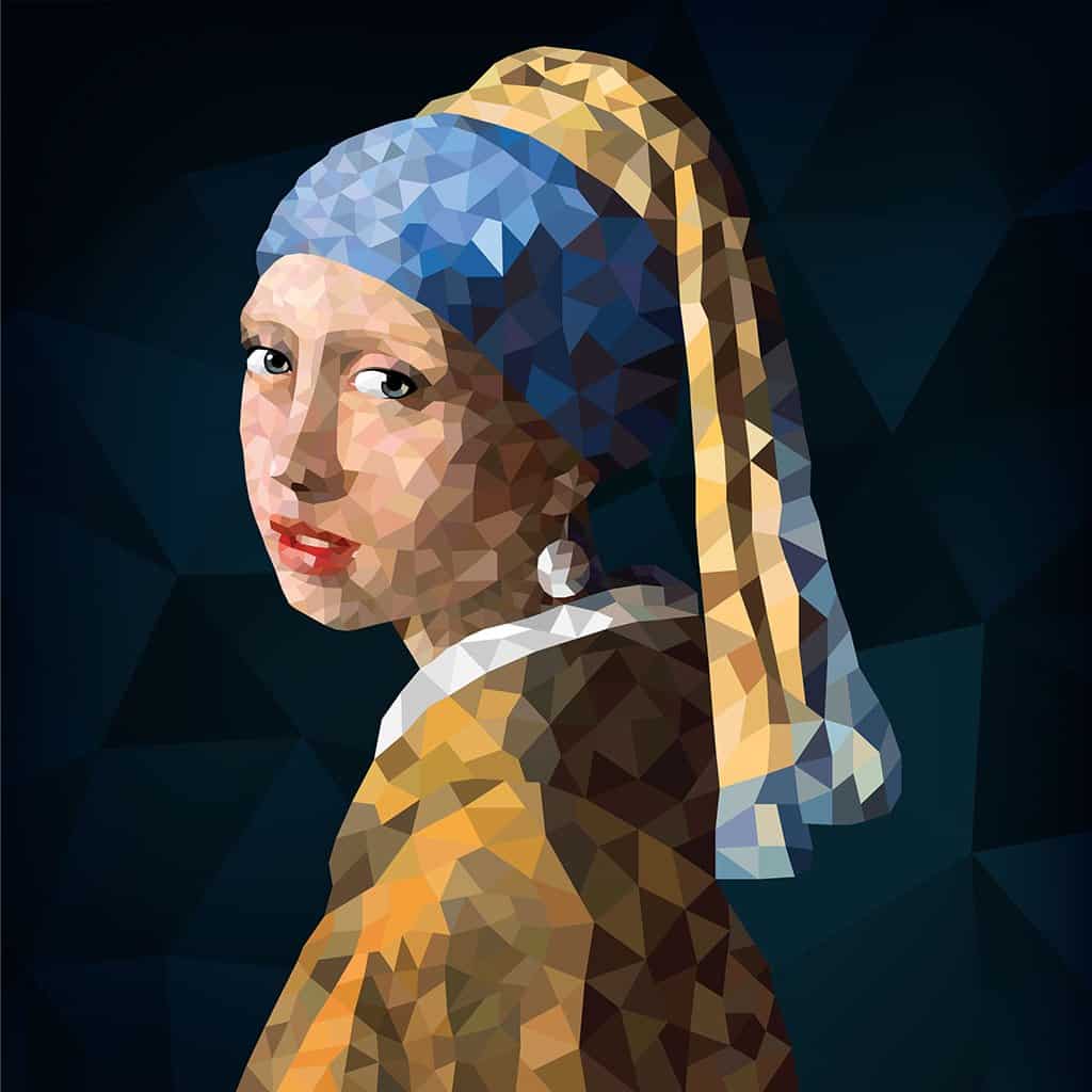 Hier is een moderne laagpolige reproductie van Vermeer's "Meisje met de parel". Dit is een tronie van een meisje met een hoofddoekje en een pareloorbelletje. Dit is een van de bekendste schilderijen van de kunstenaar. Ze wordt vaak de noordelijke of Nederlandse Mona Lisa genoemd.