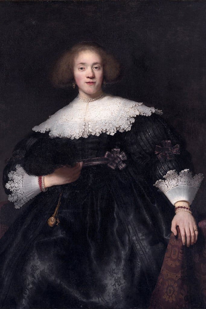 De vrouw draagt een zwarte zijden jurk met gepofte en gesneden mouwen, een driedubbele nauwsluitende kanten kraag en kanten polsbandjes. Om haar nek zit een dubbele parelketting.