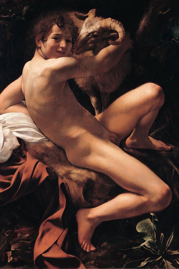 Johannes de Doper werd afgebeeld op minstens acht Caravaggio-schilderijen. Het model voor dit schilderij was Cecco di Caravaggio, een dienaar en leerling van Caravaggio, ook afgebeeld op het schilderij "De Amoer Winnaar" en een aantal andere schilderijen. De jonge Johannes is half liggend afgebeeld. Zijn hand ligt om de nek van een ram en hij draait zich met een ondeugende glimlach naar de toeschouwer toe.