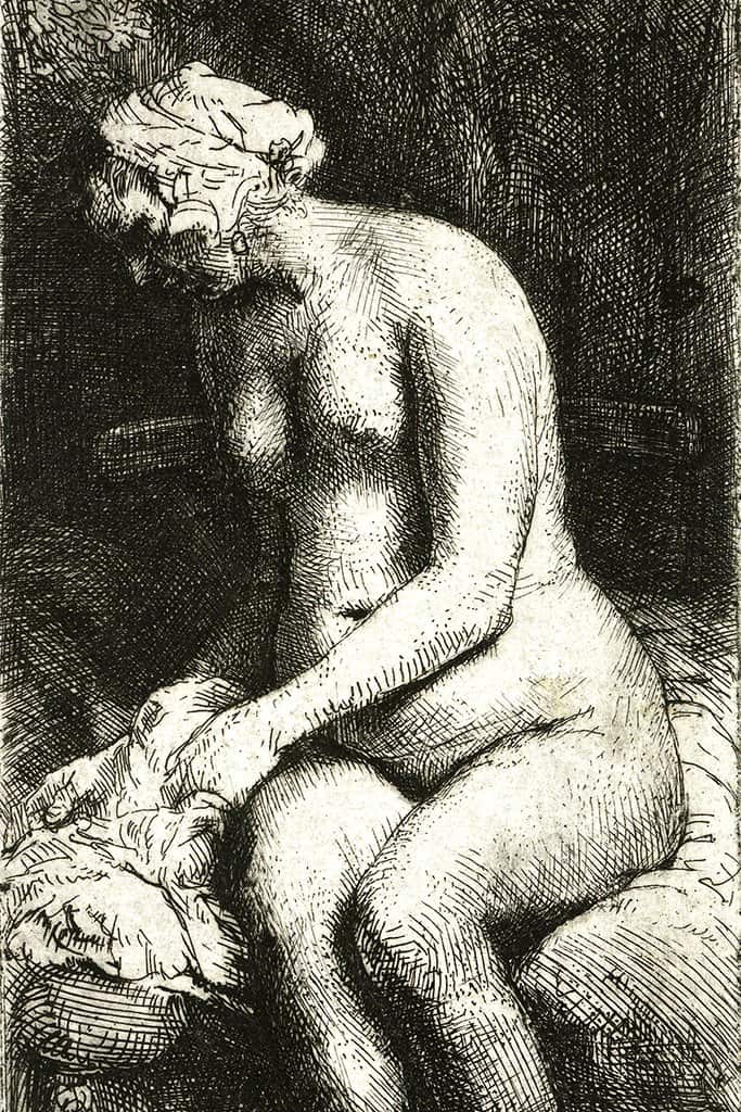 De vrouw die met haar voeten in de kreek baadt is raadselachtig als je goed naar hem kijkt. Dit laat zien hoe ver Rembrandt in zijn late carrière is afgeweken van het nauwgezette Nederlandse realisme. De naakte vrouw poseert in zijn atelier. We herkennen duidelijk de rugleuning van haar stoel en een groot kussen met kwastjes. Maar we kunnen ook het gebladerte in de buurt van haar hoofd onderscheiden, terwijl de voorgrond de beek aangeeft. Zo heeft Rembrandt op creatieve wijze het naakte lichaam van zijn atelier naar de straat verplaatst.